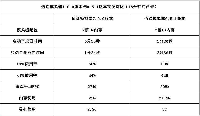 下圖是逍遙模擬器7.0.0版本與6.5.1版在相同的硬件配置、不限制幀率的情況下16開(kāi)測(cè)試夢(mèng)幻西游的資源占用數(shù)據(jù)對(duì)比。從對(duì)比圖中可以明顯看出新版本7.0.0逍遙模擬器各方面均擁有壓倒性的優(yōu)勢(shì)。如果將游戲幀率限制在更低的數(shù)值,逍遙模擬器各項(xiàng)資源占用將會(huì)更低,多開(kāi)數(shù)量將會(huì)更多。