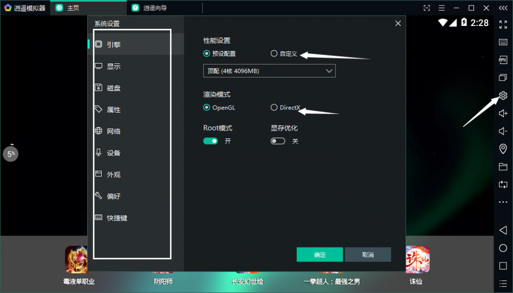 2、逍遙模擬器設置,可以自定義模擬器的各種參數(shù),包括分辨率、配置、渲染模式等等