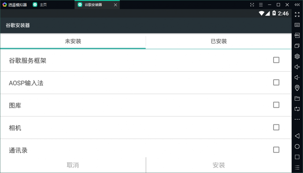 3、逍遙模擬器主界面上【內(nèi)置應用】里面點擊谷歌安裝器,安裝谷歌框架服務