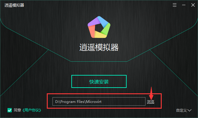 1、下載好逍遙模擬器之后,在電腦本地得到一個.exe文件,雙擊.exe文件進入軟件安裝界面,您可以點擊【快速安裝】,軟件會自動安裝,您可以點擊【自定義】選擇安裝路徑。