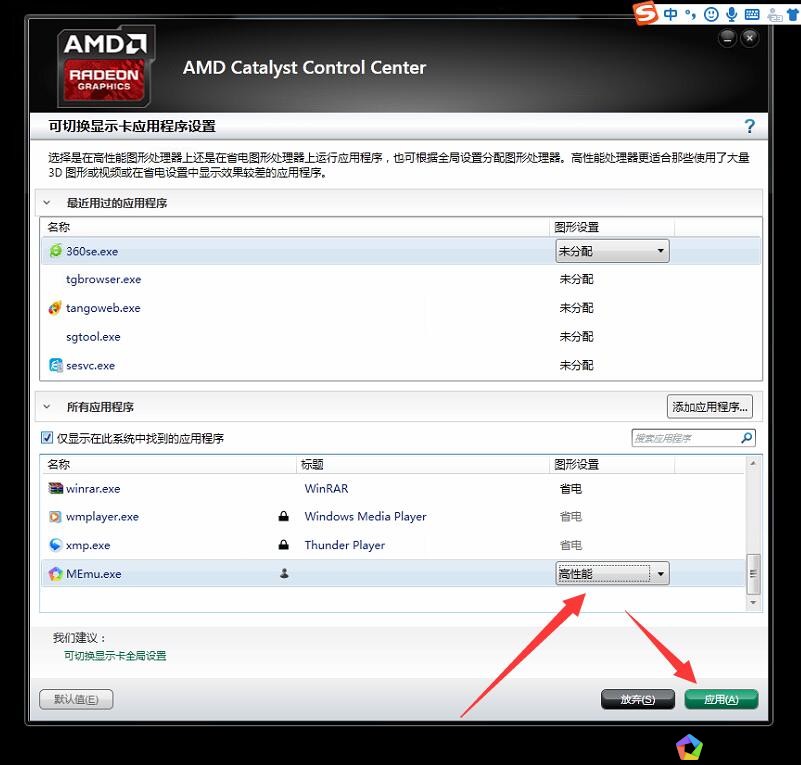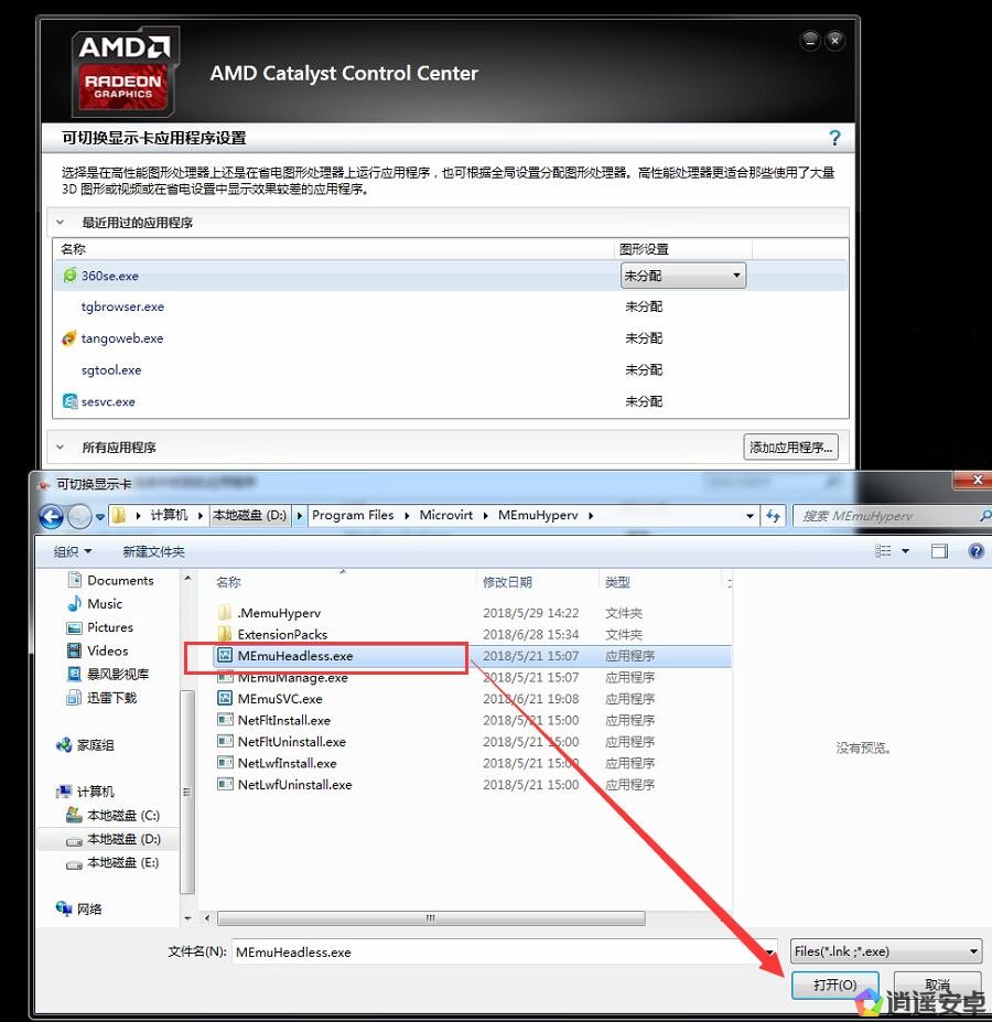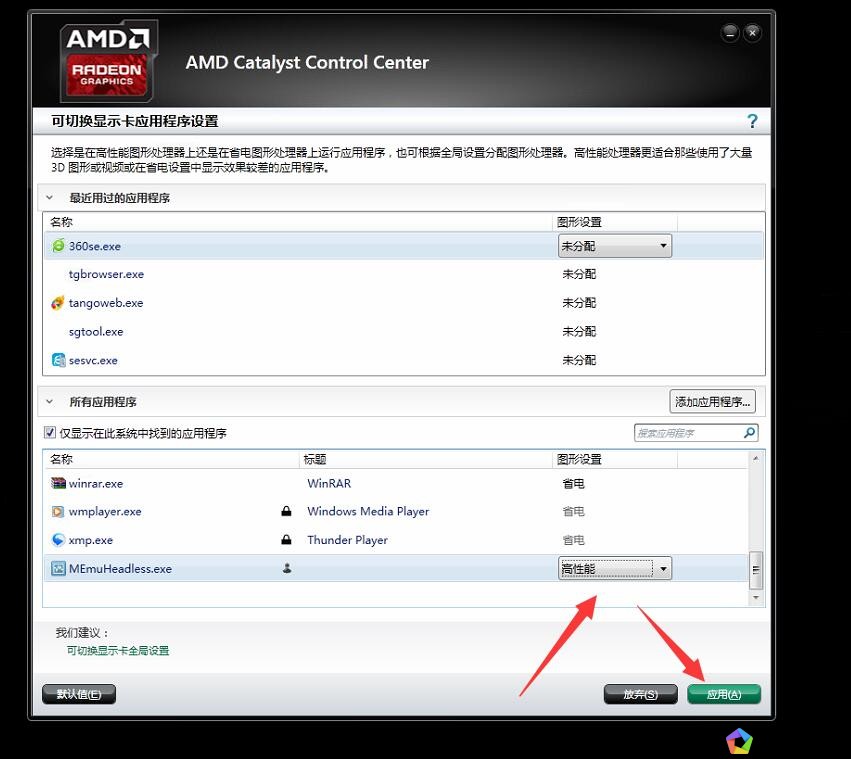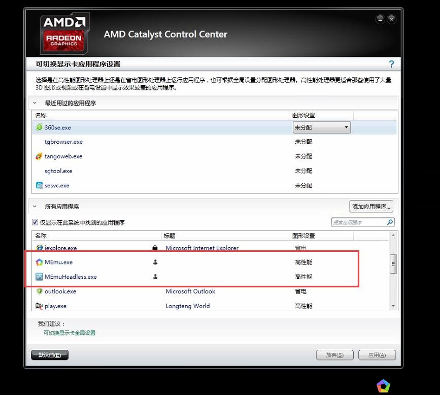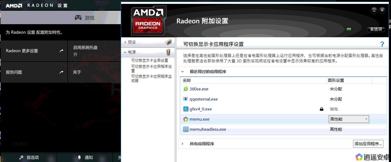 AMD如何切換獨(dú)立顯卡 最近修改日期:2024-2-21 老版本 AMD顯卡設(shè)置 切換時(shí)需要關(guān)閉模擬器注意看紅色字 1、新AMD顯卡驅(qū)動切換設(shè)置 2、鼠標(biāo)桌面空白處右鍵配置可換顯卡 選擇添加應(yīng)用程序找到你的模擬器安裝目錄 里的MEmu.exe選擇打開選擇高性能點(diǎn)擊應(yīng)用再選擇添加應(yīng)用程序模擬器安裝目錄MEmuHyperv文件夾里MEmuHeadless.exe點(diǎn)擊打開選擇高性能點(diǎn)擊應(yīng)用 正確切換后,如圖下