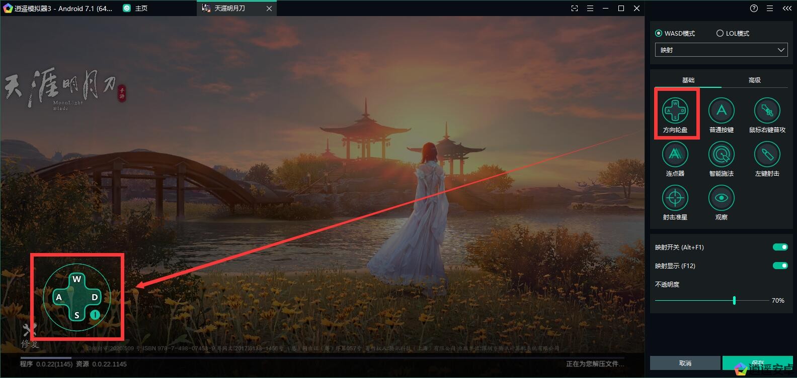 把方向輪盤拖拽到游戲界面的人物移動(dòng)輪盤處,按W/A/S/D控制人物前后左右移動(dòng)。(也可以自己更改鍵位設(shè)置)。