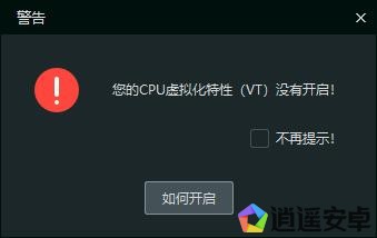 如果你的模擬器運行時出現(xiàn)以下彈窗,或者模擬器窗口右上方出現(xiàn)感嘆號一樣的警告標志,說明VT功能未正常工作。