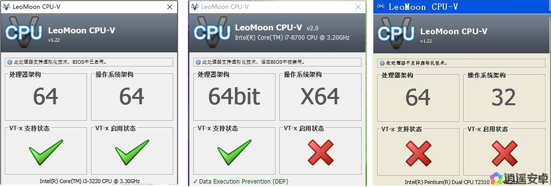i) 兩個綠色勾勾:說明電腦完全支持VT功能。但如果仍然出現(xiàn)逍遙VT警告的話,說明可能有其他程序正在占用著VT功能。比如:微軟Hyper-V,或者360核晶防護等。可以考慮把他們關(guān)閉。