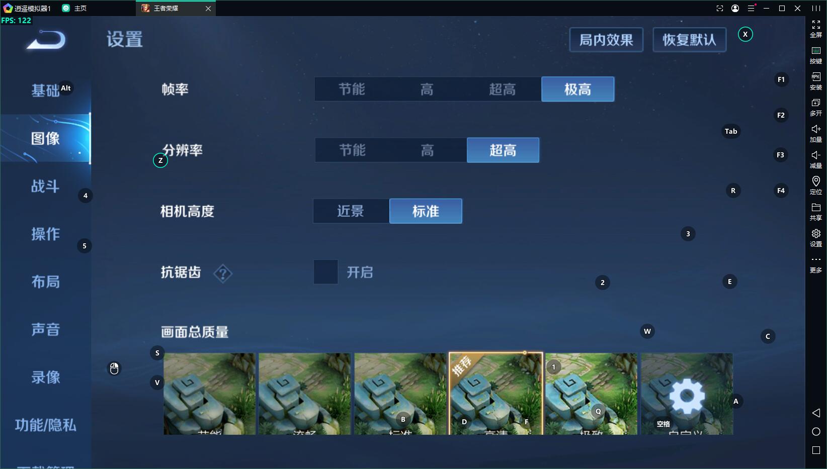 【王者榮耀】如何開啟高幀率+高畫質(zhì) 最近修改日期:2024-7-02 一、如何開啟極高幀率1、打開模擬器設(shè)置界面,選擇SAMSUNG Galaxy S22機(jī)型或模擬器設(shè)置自定義機(jī)型:nubia NX709S 或者 vivo V2186A 兩個(gè)都可以 2、模擬器設(shè)置率把高幀率打開,選擇120FPS,重啟模擬器,然后在游戲里把幀率選為極高 二、如何開啟高畫質(zhì)1、若想同時(shí)開啟畫質(zhì)與極高幀率,則只能自定義vivo V2186A機(jī)型2、如果做完上述操作無法開啟畫質(zhì),提示機(jī)型不適配,再打開模擬器設(shè)置界面,勾選“軟件”即可。