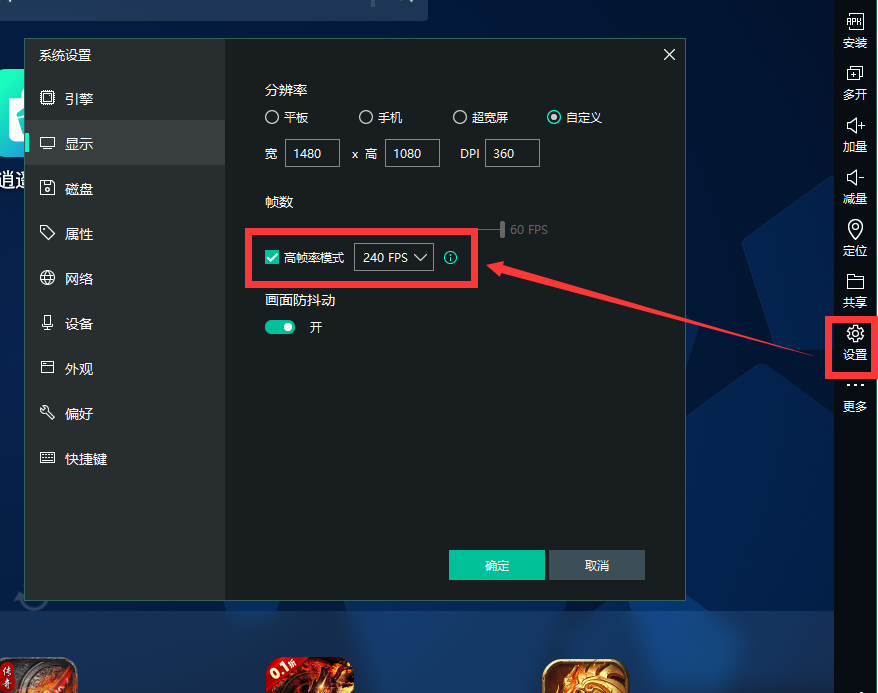 ①打開模擬器設(shè)置界面,勾選120幀/240幀選項