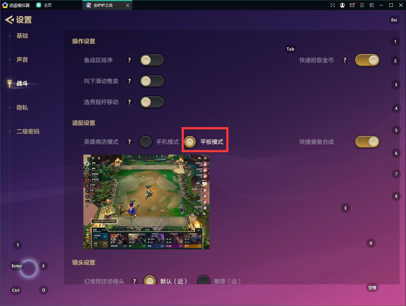如果發(fā)現(xiàn)還不是端游模式,打開游戲設(shè)置界面-戰(zhàn)斗,選擇“平板模式”