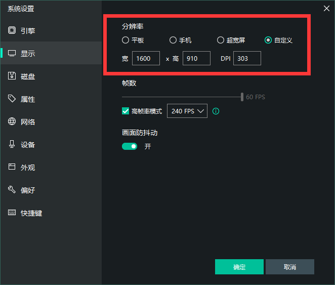 打開模擬器右側(cè)設(shè)置——顯示——分辨率自定義
