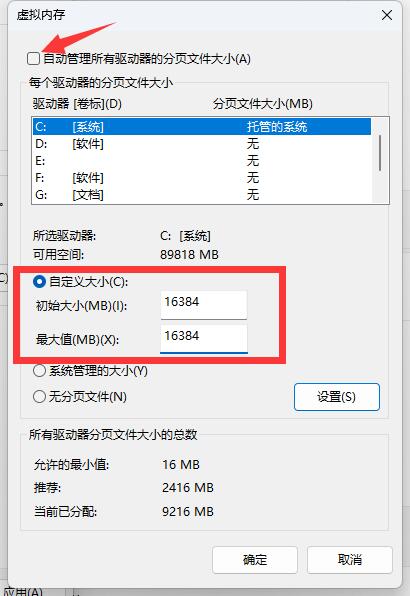 4、在虛擬內(nèi)存頁(yè)面中,如自定義大小處為灰色,請(qǐng)先去除上面的勾選項(xiàng);選擇自定義大小更改為16384MB,更改完成后點(diǎn)擊設(shè)置按鈕,如圖