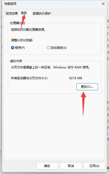 3、進(jìn)入設(shè)置后,再次選擇性能選項(xiàng)中的高級(jí)選項(xiàng)-虛擬內(nèi)存點(diǎn)擊更改,(如圖)