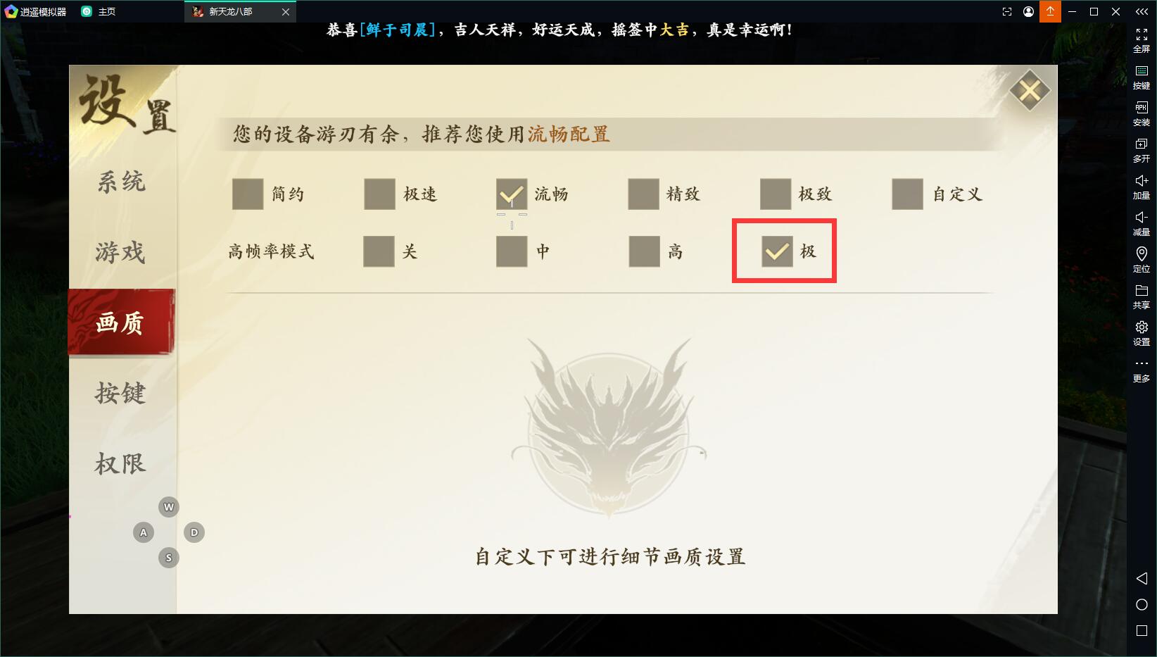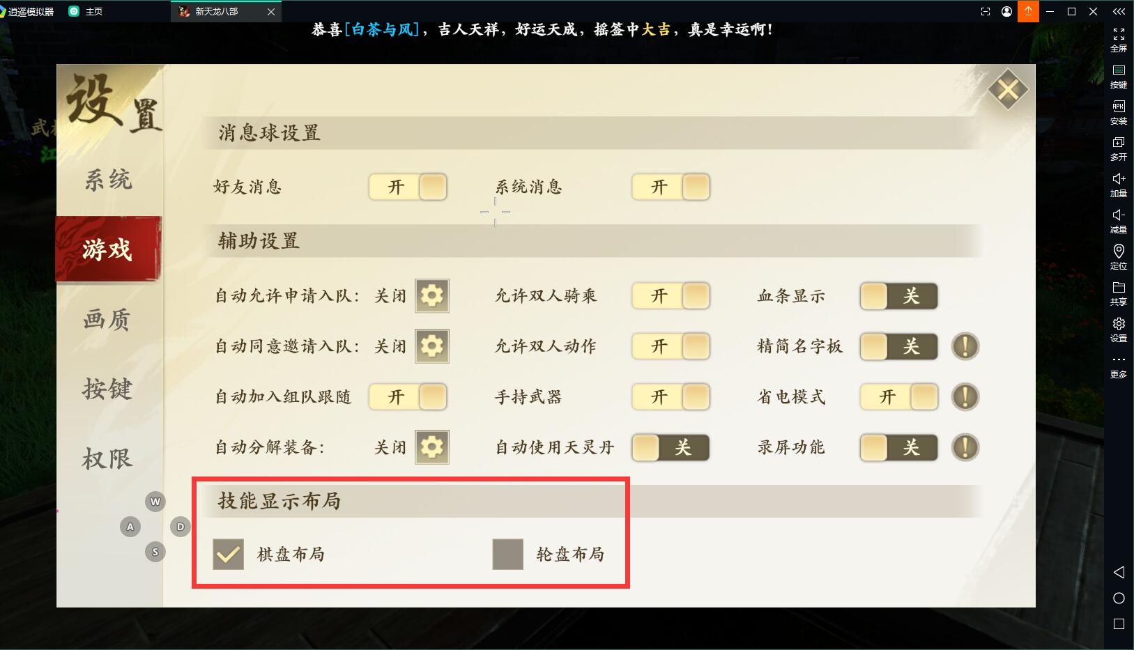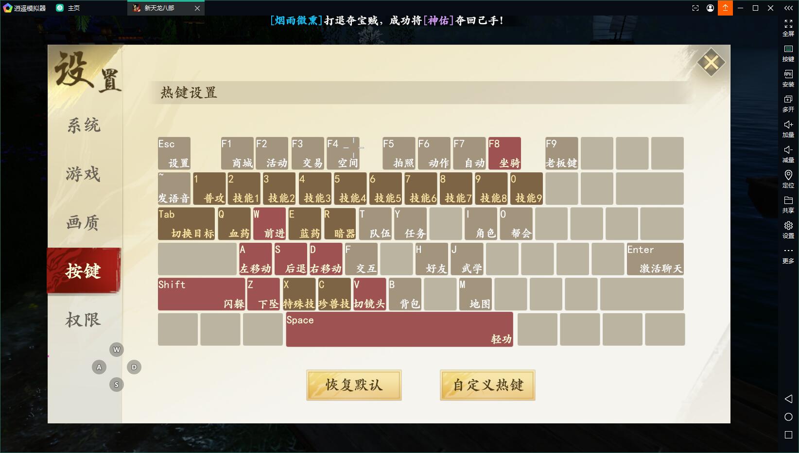 【新天龍八部】游玩指南 最近修改日期:2024-2-21 1、按鍵映射使用說明本游戲直接適配了端游版按鍵,直接使用鍵盤操縱即可,點(diǎn)擊設(shè)置里的按鍵可以自定義更改2、技能顯示布局游戲里有棋盤、輪 盤兩種布局模式,點(diǎn)擊設(shè)置里的選項(xiàng)可進(jìn)行切換3、開啟高幀率打開設(shè)置界面,在畫質(zhì)里的高幀率模式勾選“極”