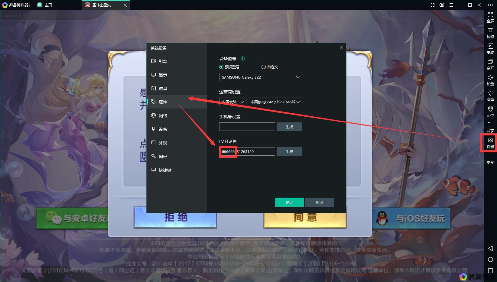 1、打開模擬器設(shè)置界面,點擊屬性,把IMEI的前6位編碼改成666666