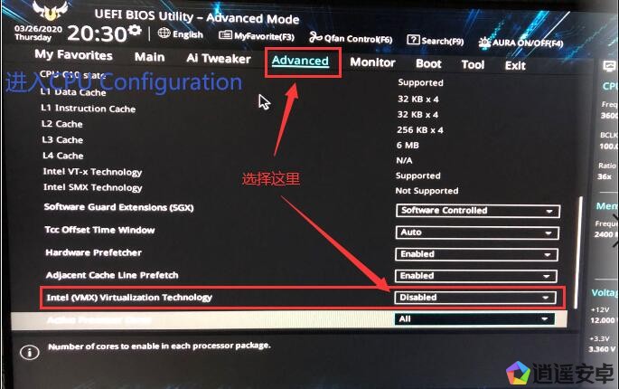華碩主板 Intel 虛擬化設置 名字叫Intel Virtualization Technology(Intel虛擬化技術(shù)) 進入 Advanced →進入CPU Configuration