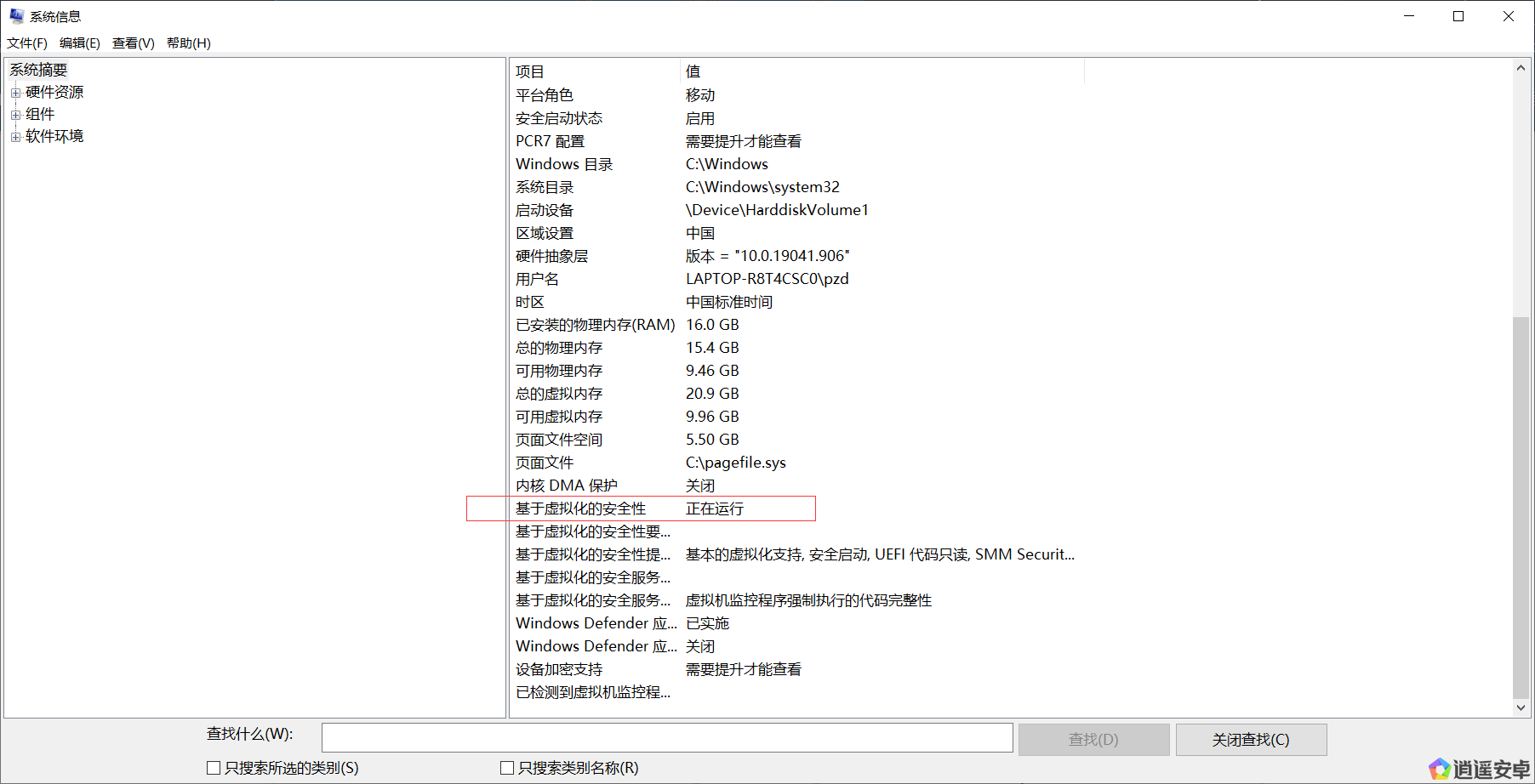 2、在右側(cè)頁面的“系統(tǒng)摘要”下,向下滾動(dòng)到“基于虛擬化的安全性”,然后確保將“值”設(shè)置為“未啟用”。
