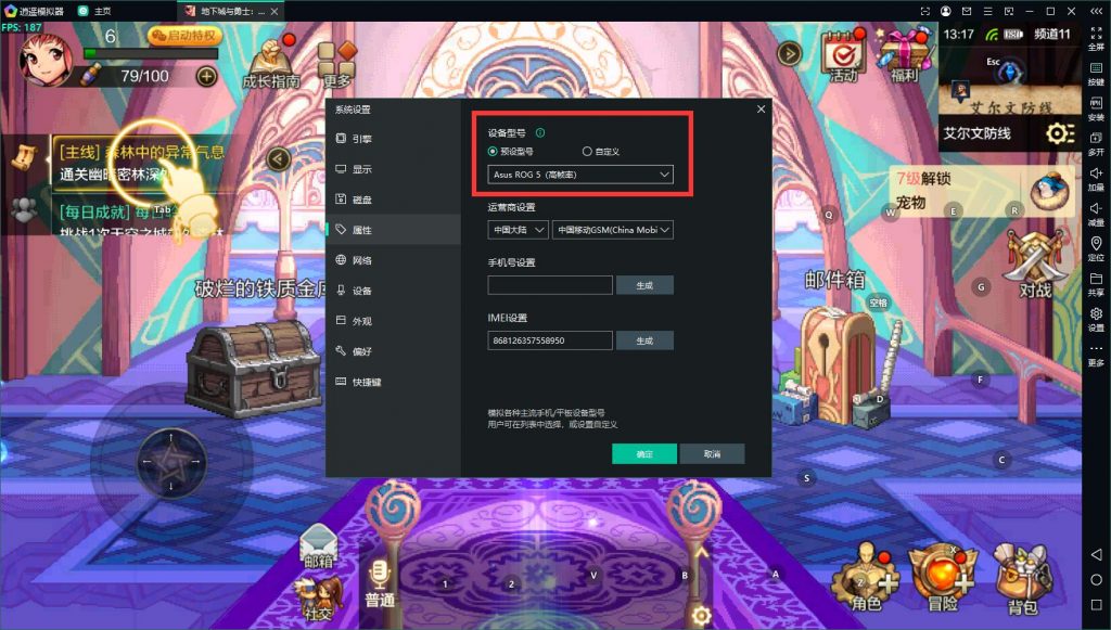 1、打開模擬器右側(cè)的設(shè)置按鈕,在屬性中選擇ROG5機型(選擇此機型也可以適配逍遙官方制作的按鍵映射)。