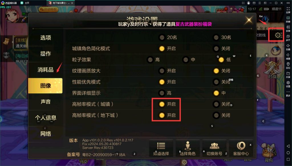 2、選擇開啟高幀率模式240FPS,選擇完畢后,確定,重啟模擬器即刻生效。