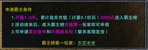 1、開服1-3天活動時間內,累計真實充值(計算0.1折后)2000元進入霸主榜