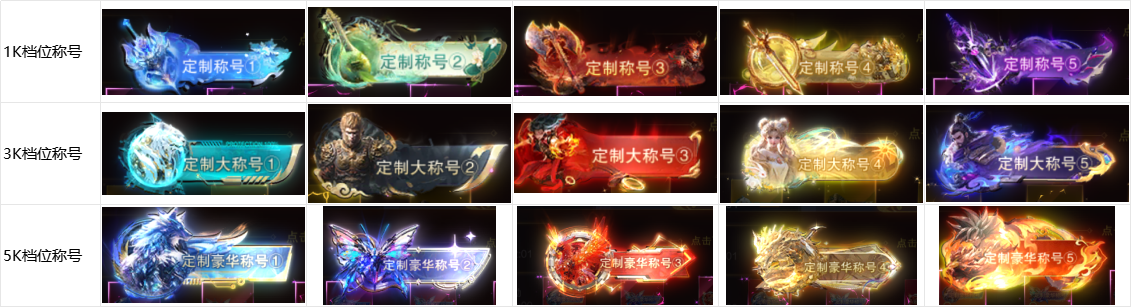 2. 提供模板任選,內(nèi)容可游戲內(nèi)自定義,文案限制6個字內(nèi),同檔位不能申請重復(fù)模版,稱號定制內(nèi)容不能有辱罵敏感詞等,若有發(fā)現(xiàn)將回收處理。