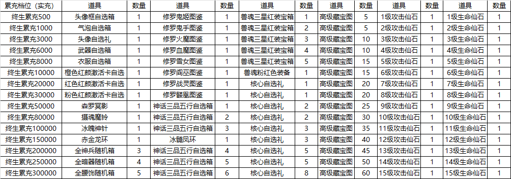 活動二、終生累充活動(滿足條件郵件自動發(fā)放,代金券消耗計(jì)入其中) 活動計(jì)算單角色累計(jì)實(shí)付充值,達(dá)到對應(yīng)檔位需求后即可領(lǐng)取對應(yīng)檔位獎(jiǎng)勵(lì),每個(gè)檔位僅可領(lǐng)取一次