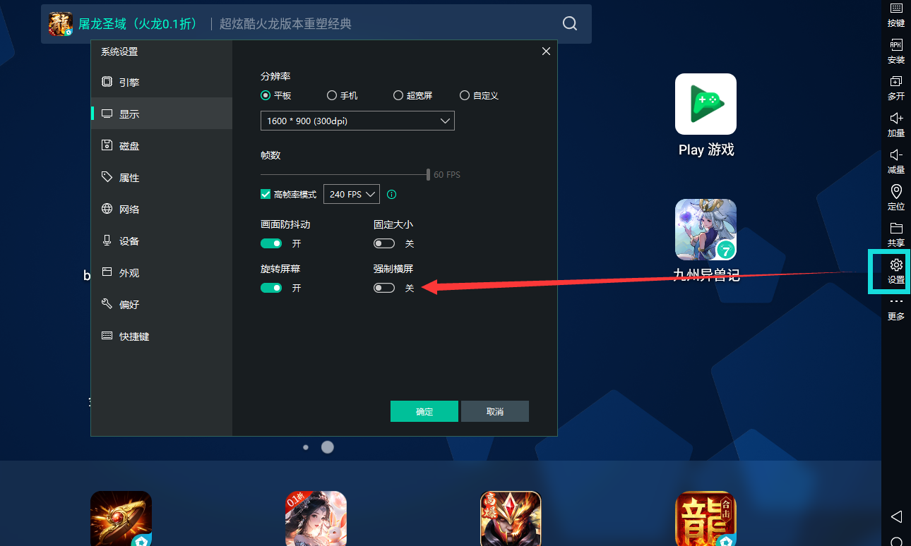 打開模擬器右側(cè)側(cè)邊欄“設(shè)置”界面,在“顯示”里把“強(qiáng)制橫屏”打開即可