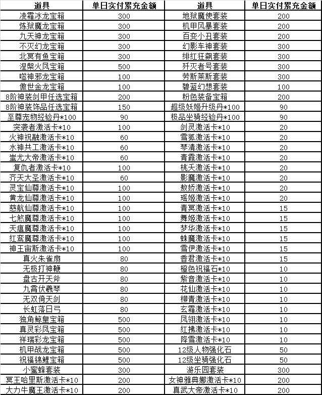 2、單日達(dá)到充值條件(額度足夠情況下可自由搭配等值道具內(nèi)容和數(shù)量)的玩家,選好道具后可向平臺(tái)客服申請發(fā)放;