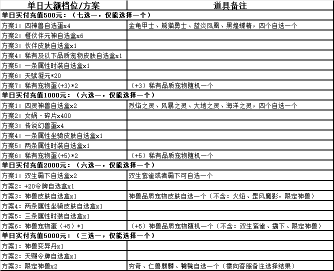 單日累計充值100000(實付500)元:四神獸自選蛋*2、8級寶石禮袋*9、超級技能書自選盒*6、星辰藏寶圖*10;
