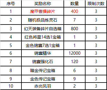 累計充值40000元(折后實(shí)付):8級靈石選擇寶箱*1,紅色陣法石自選寶箱*100、魔甲曹操碎片*200