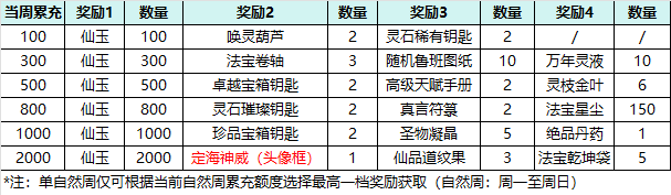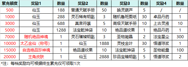 1、周累充返利:單自然周累充滿足充值條件可選最高一檔累充獎勵,自然周計算累充只可選擇其中固定一個充值檔位,例:單自然周充值1000,可申請當(dāng)周累充1000/800/500/300/100 其中一檔,不可重復(fù)領(lǐng)?。ㄗ匀恢埽褐芤恢林苋眨?br />2、終生累充返利:查詢玩家對應(yīng)累充金額給予終生累充返利,歷史累積充值檔位終生僅可申領(lǐng)一次