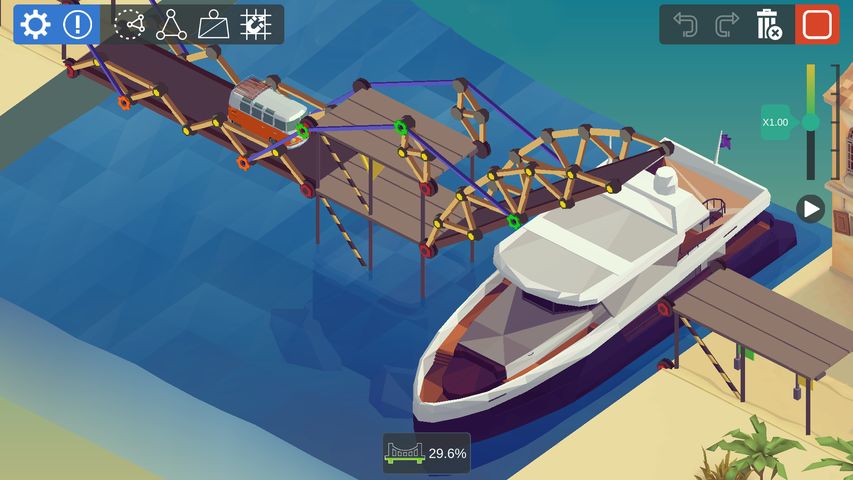 這款游戲提供了讓您自由的發(fā)揮創(chuàng)作和設(shè)計(jì)橋梁的結(jié)構(gòu),主要目的就是讓卡車(chē)通過(guò)橋梁,后期更要使輪船、熱氣球、飛機(jī)等通過(guò)。